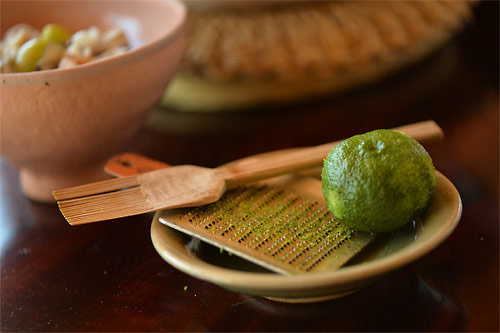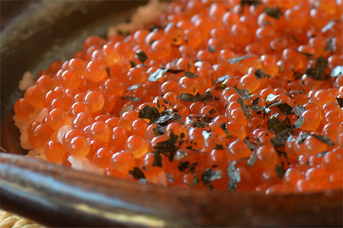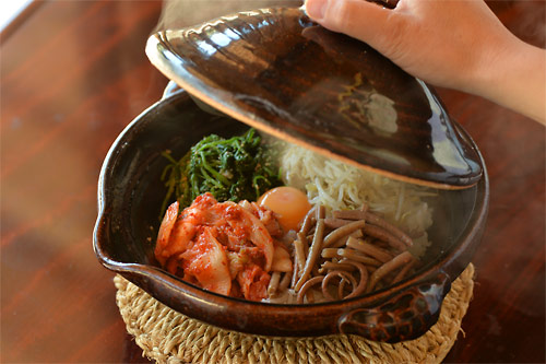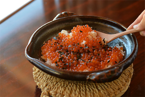 卵黄をのせて、食卓まではこぶあいだ蓋をして。
