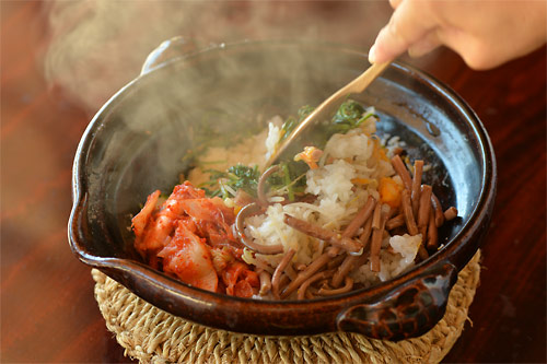土鍋にまるい金網を敷いて、お湯をわかし、