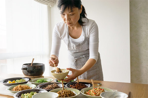 ごはんをよそって、好きな味を組み合わせていただきます。