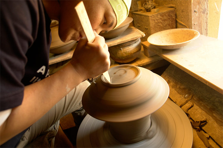 土楽さんの工房でカレー皿をつくる道歩さん。