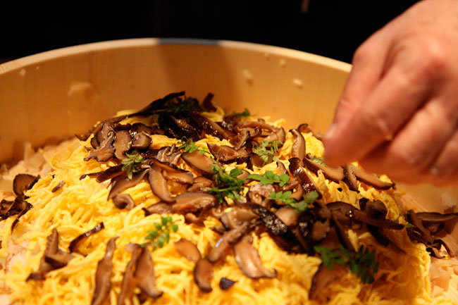 干ししいたけの甘煮と山椒の葉を入れて、