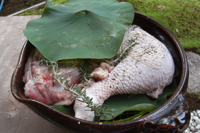 その上に蓮の葉、アルミホイルにくるんだ鶏肉、