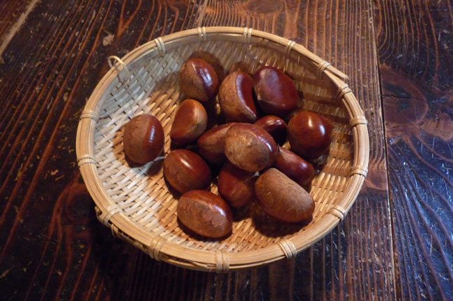 栗は鬼皮と渋皮をむき、塩水につけ、しばらく置きます。