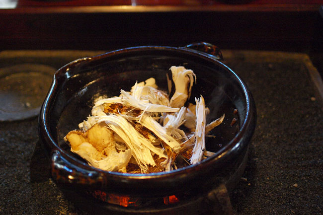 手で裂いた松茸に藻塩をぱっと振りかけ、