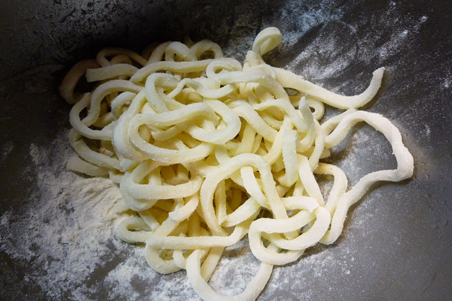 小麦粉をまぶしたらすぐに、油で揚げます。