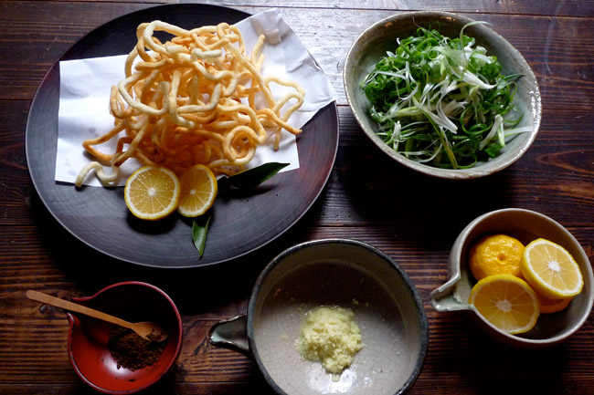 揚げうどん土鍋仕立ての具は九条葱のみ。