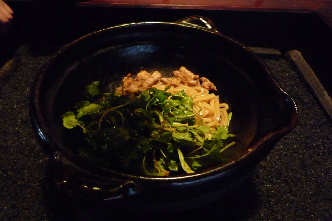 鶏肉と山菜の鍋に、うどん玉を入れ、