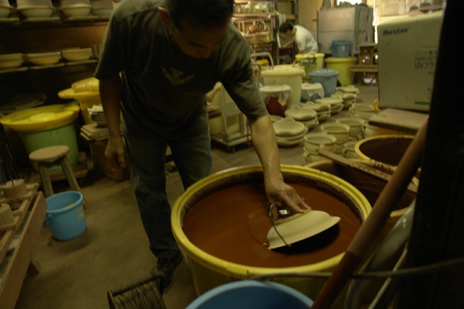 手で持って、釉薬にくぐらせます。