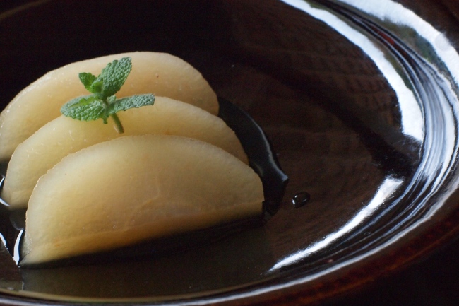 そしてこちらは、梨のシャンパン煮、ミント添え。