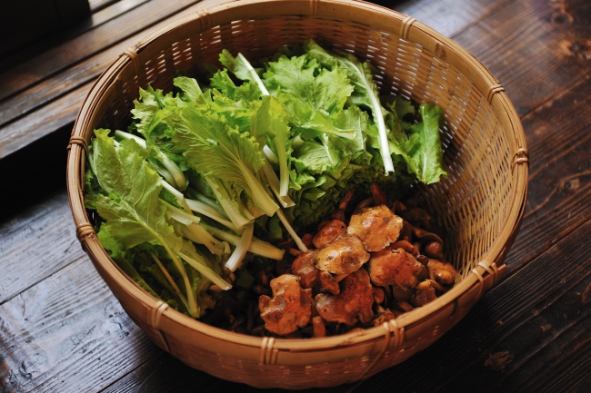 「野菜も食わんといかんな」と福森さん。 山東菜という、はくさいの原種といわれる野菜を、福森さんは育てています。 それと、裏山で採ったきのこ。 福森家では「和ポルチーニ」と呼んでいます。 それくらい、おいしいんですって。