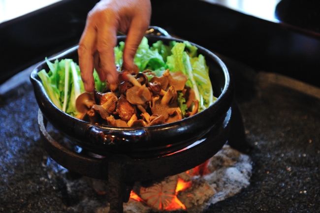 牛の旨味がのこっている土鍋に入れ、お酒で蒸し煮に。