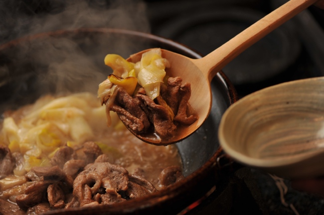 牛すきのように、新鮮な溶き卵でからめても、