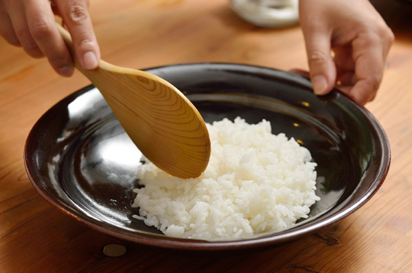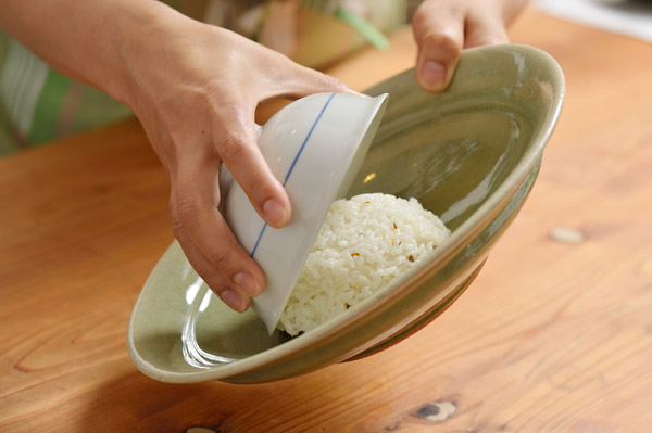 ごはん茶わんによそったごはんを、ぽんとひっくりかえしてのせます。