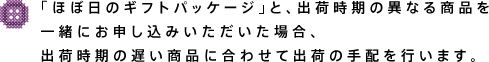 お申し込みいただいてから、 3〜7営業日後に出荷の手配を行いますが、 出荷時期の異なる商品を いっしょにお申し込みいただいた場合、 出荷時期の遅い商品にあわせて、 出荷の手配を行います。 出荷時期の遅い商品に 出荷をあわせたくない場合は、 別々にお申し込みください。 なお、別々にお申し込みいただいた場合、 それぞれのご注文に配送手数料が発生しますこと、 あらかじめご了承ください。 「ほぼ日のギフトパッケージ」は、