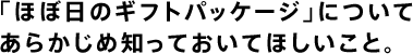 ![]() お申し込みをご検討くださいまして、 ありがとうございます! 「ほぼ日のギフトパッケージ」は、 インターネットでのみ販売しているため、 手にとってご覧いただいたり、 お店のスタッフに直接質問したり、 そういうったことができません。 そこで、みなさまがお申し込みをされる前に、 「ほぼ日のギフトパッケージ」について、 これだけは「知っておいてほしいこと」を、 ここで、ちょっとだけ詳しく、 お知らせさせていただいております。 お申込みをご検討いただいているかたは、 ぜひお読みくださいね。 商品の写真は、現物を撮影しているのですが、