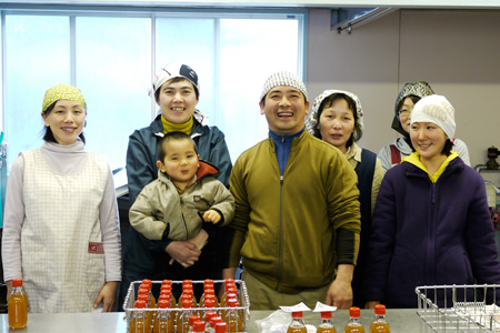 | 美郷さん | いつもは「畑班」と「シロップ班」に わかれて作業をしているんです。 でもきょうは、 「手かげんしないしょうがシロップ」の 最初の本番の日なので、 畑班もこちらに参加しています。 |