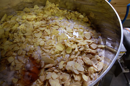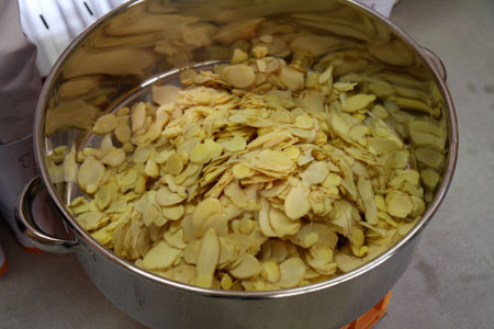 ここもまた、手間と時間のかかる工程。 しょうがの成分がなるべく出るように、 薄く、1ミリの厚さにスライスしていきます。 |