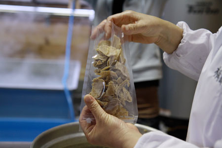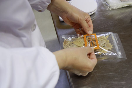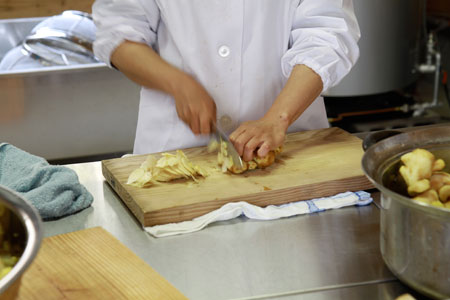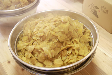 包丁をつかった手作業です。 きれいな「しょうがチップ」をつくるためにも、 ここでの手かげんもできません。 |