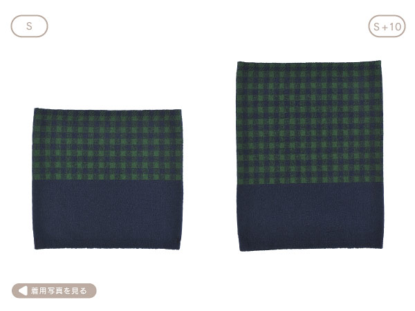 スクールチェック・ツートン (のびのびタオリン)  制服みたいな、落ち着いたギンガムチェックと、 紺色の無地の、ツートンハラマキです。 上下を巻きかえることで、 気分に合わせて、チラっと見せる柄が変わるので、 様々な服に合わせることができます。 おそろいで、けいとのぱんつと レッグウォーマーもご用意しました。 10cm長いサイズもありますよ。