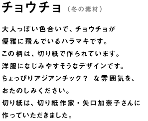 チョウチョ(冬の素材)  大人っぽい色合いで、チョウチョが 優雅に飛んでいるハラマキです。 この柄は、切り紙で作られています。 洋服になじみやすそうなデザインです。 ちょっぴりアジアンチック? な雰囲気を、 おたのしみください。 切り紙は、切り紙作家・矢口加奈子さんに 作っていただきました。