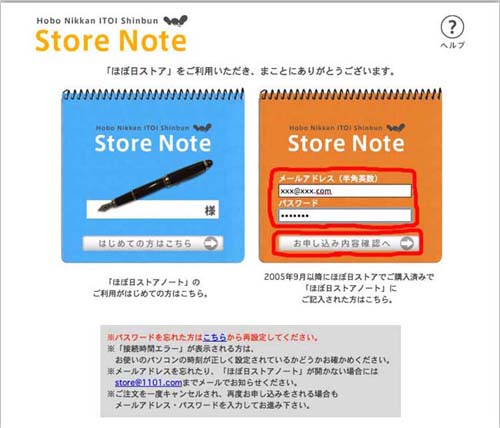 4. Please enter your email address and password in the area marked in red to open "Hobonichi Store Note". |