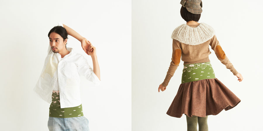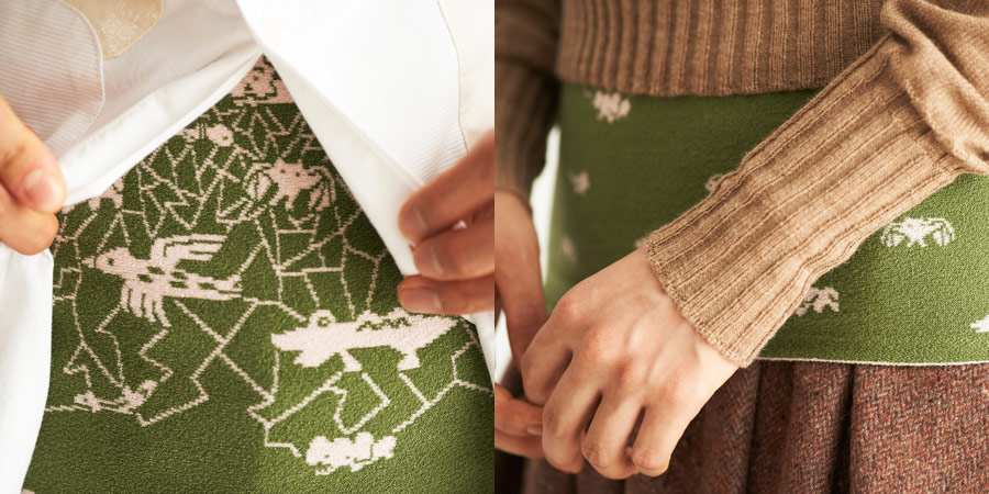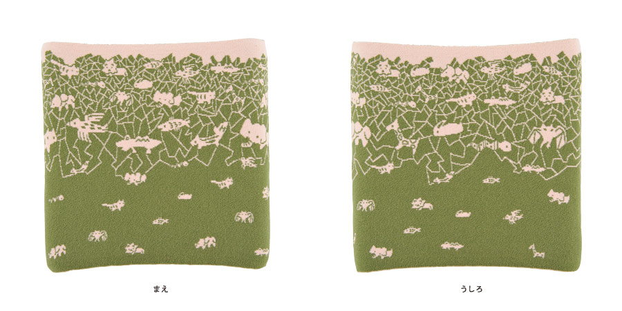 グラデーションで変わっていく柄を、 ワニや、ライオン、コウモリなどのどうぶつたちと、 ラインの変化によって表現したデザインです。 渋めのカーキとピンクの組み合わせは、 かっこよさとかわいさが溶け合うようなムード。 柄の中にかくれている アニマルを探すのも、たのしいハラマキです。 リバーシブルでも、もちろんOK。 けいとのぱんつ、レッグウォーマーも おそろいで使っていただけます。