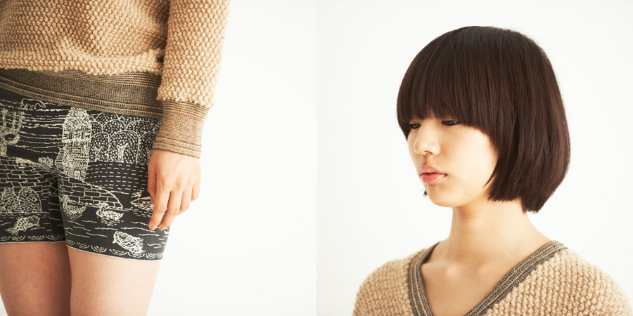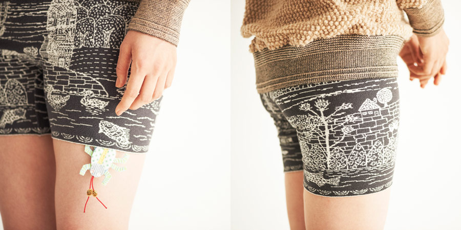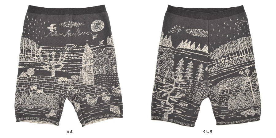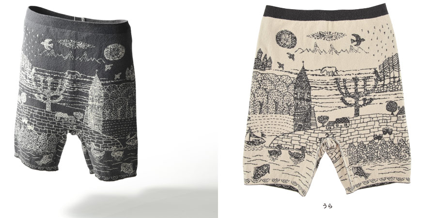 全面に細かい絵が入った、 めずらしいけいとのぱんつ。 この風景に、お尻をすっぽりつつまれると、 うれしい気持ちになれそうです。 ハラマキ、レッグウォーマーと 3つセットで身につけたくなります。 けいとのぱんつも、 気分で裏返しにするとたのしいんです。