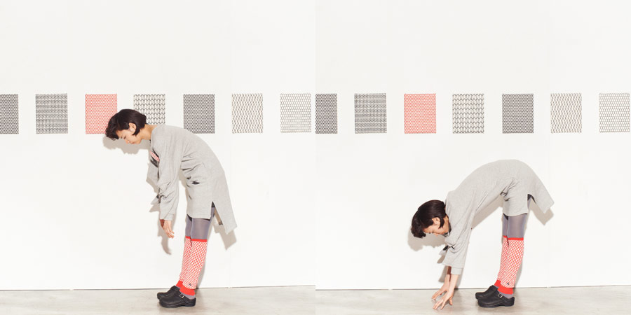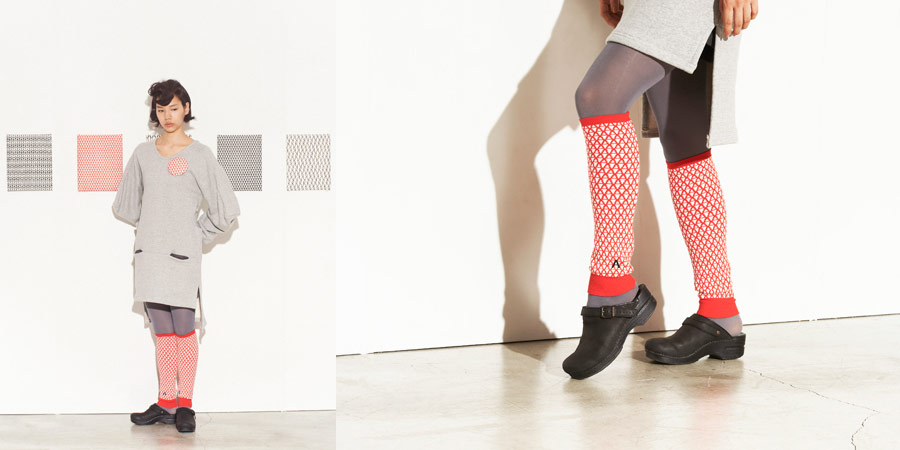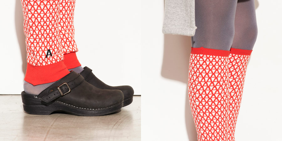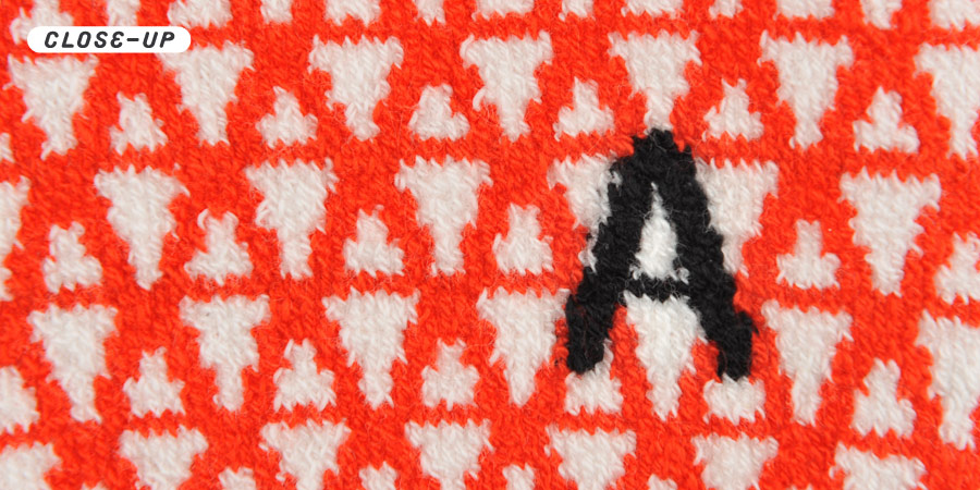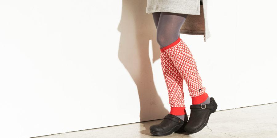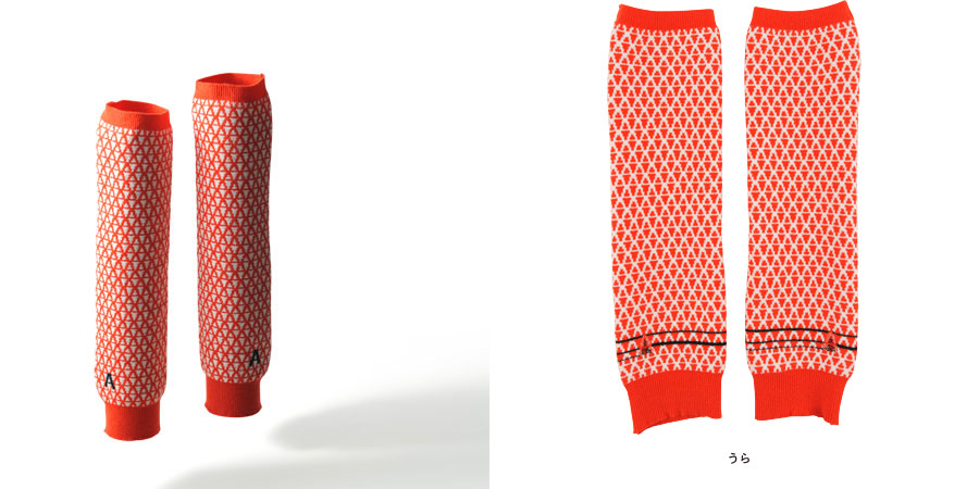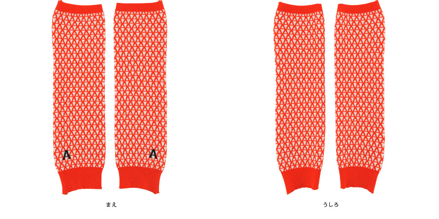 ハラマキとおそろいの、 アルファベットの「A」をモチーフに作られた柄の レッグウォーマーです。 赤い色は視覚的にも、あたたさを感じるそうですよ。 ワンポイントになっている黒い「A」もかっこいいです。