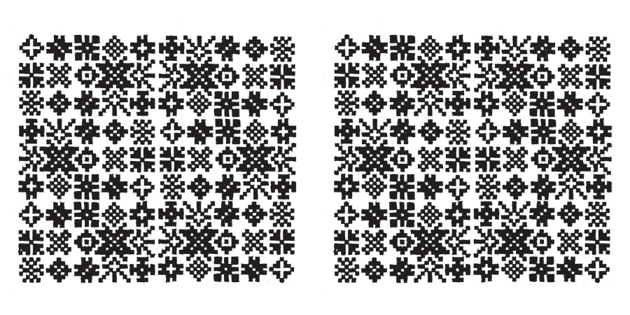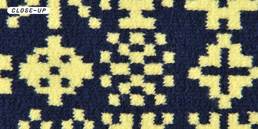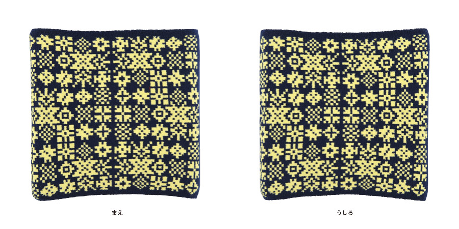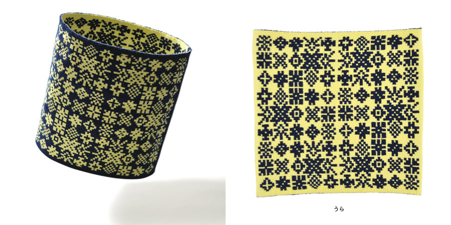 ちりばめられた柄はそれぞれ、 ノルディックのセーターなどによく使わるもので 日本では「雪柄」と呼ばれていますが、 そもそもは「星」をイメージしたものだとか。 「エイトポインテッドスター」という、 角が8つある星柄は、 編みものではつくりやすいデザインなのだそうです。 「伝統柄の星」と「三國さんオリジナルデザインの星」を コレクションして並べたのが、このハラマキ。 おおきな星だけを線でつなぐと、 輪のかたちになって、 夜空にまたたく冬の星座のように見えるんですよ。 裏返しても、かっこいいです。