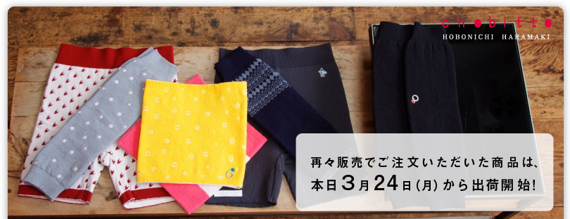 ほぼにちわ! すっかり春めいてまいりました。 さて、今日は「ほぼ日chobittoハラマキ」に関する、お知らせです。 2月の再々販売でご注文いただいた商品は、 また、お使いになられての感想や、 これからも、ほぼ日ハラマキをよろしくおねがいいたします! |