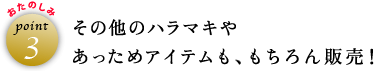 ご好評をいただいた 「秋のウレマッタ」のラインナップを中心に、 ハラマキの販売はもちろん レッグウォーマー、アームウォーマー、 ブランケットの販売を行う予定です。 寒い季節への準備として、贈り物にも喜ばれますよ。 価格: ハラマキ、レッグウォーマー、アームウォーマー/3,400円 ブランケット/5,200円(すべて税込) ※ハラマキはS、Fサイズのみのお取り扱いです。 ※数に限りがあります。 品切れの場合があることをご了承ください。