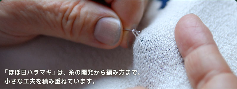 ![]() ハラマキを巻いたときの、 しめつけ感をすくなくするため、 糸の芯に入っているゴム糸の伸縮率を、 できるかぎり弱めにしています。 |