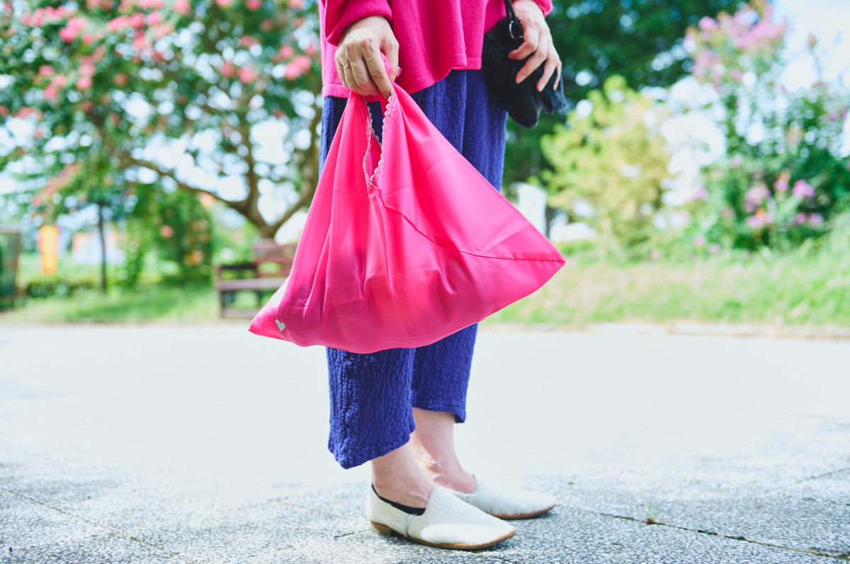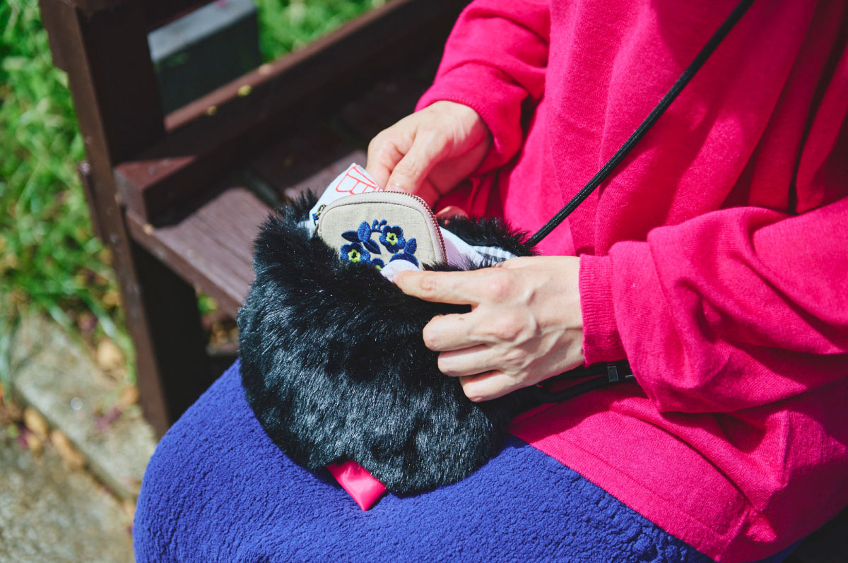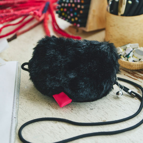 We worked with artist Naoko Horiguchi to create this fluffy pouch shaped like a black cat’s face. It’s a small pochette you can hang from your shoulder, and it includes a bright pink reusable bag reminiscent of a cat’s tongue because you pull it out from where the cat’s mouth would be.