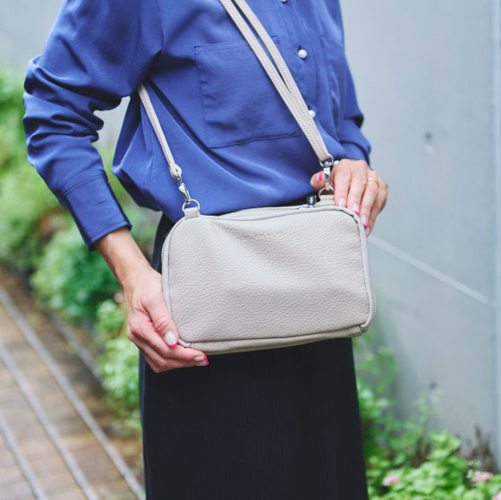 Fumika Hideshima is a radio DJ and narrator involved in a wide variety of projects. We worked with her to create a shoulder bag type Drawer Pouch that has a broad gusset and plenty of pockets for maximum storage space. The pouch is engraved with a phrase that is near and dear to her: “Relax, just enjoy.”
