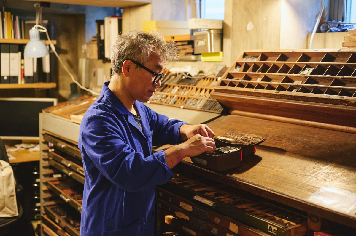 Printer's Drawer is a box-shaped pouch with movable dividers inspired by a letterpress drawer. It was created alongside art director Mitsunobu Hosoyamada and comes in two sizes: large for storing things like computer cords, and small for small items such as medicines.
