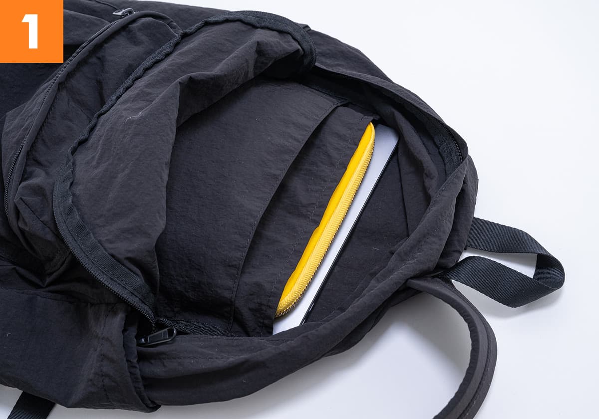 You can also use it to organize your main bag by stowing your laptop or a change of clothes inside it and putting it into your main bag. It folds up into a compact shape so you can keep it in your main bag for whenever you need another one, like when you’re out shopping.