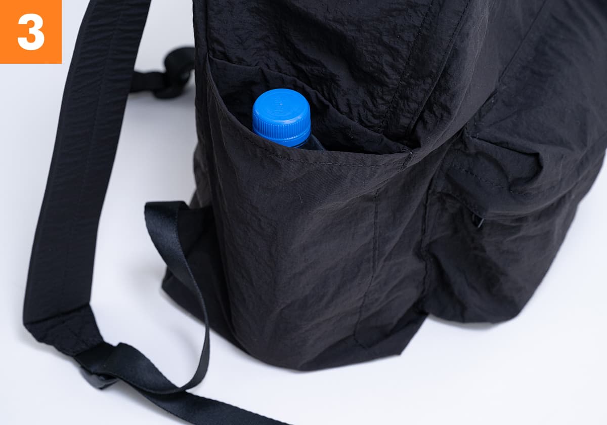 The backpack is lightweight at 300g (10.5oz). It’s made with a durable nylon material that works great as a sub-backpack you can carry around on trips or when shopping.