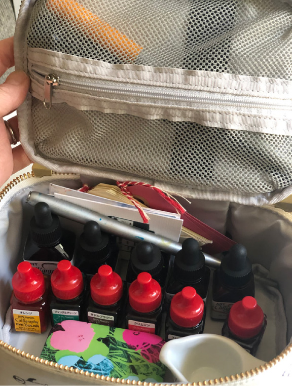 趣味のカリグラフィーセットが、ぴったり。インク、ペン先の入った缶、ミニカード、お水を入れる小さなミルクピッチャーも収まります。