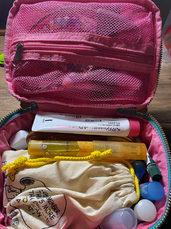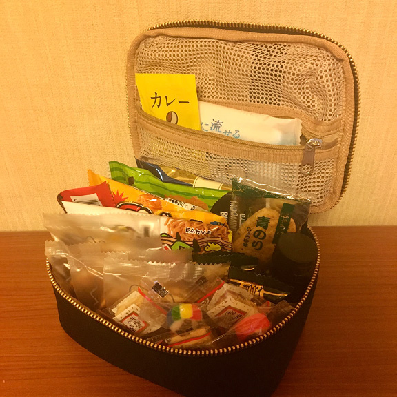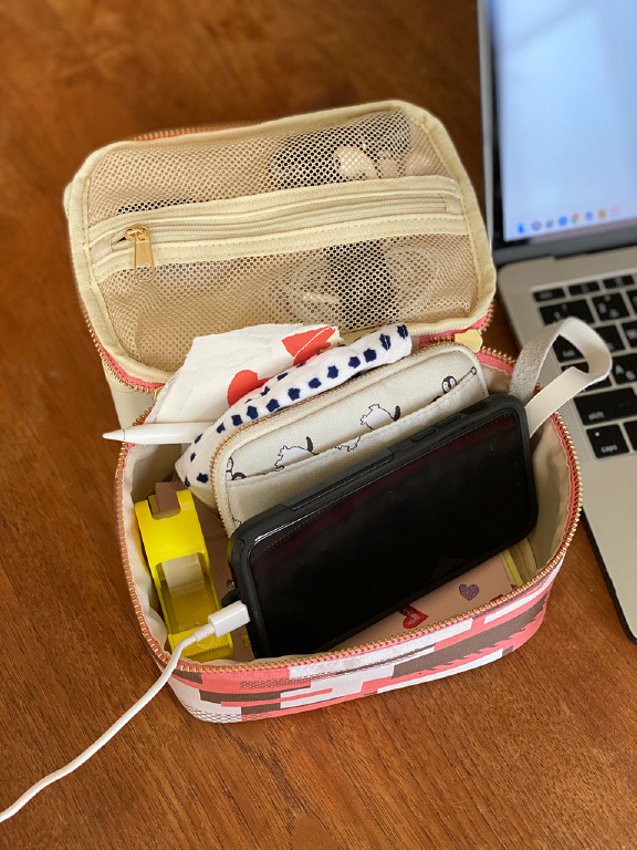 会社のデスクで仕事をするときの、おやつポーチです。口さみしいとき、好きなものがいつでも食べられるように、おせんべいやキャンディ、チョコレートをストック。ハンドクリーナーのボトルや、ウェットティッシュも入れています。これだけたくさん詰めても、ふたをしめるときは、お菓子を寝かせて収納すれば、ジッパーがちゃんと閉まります。ふたを閉じてしまえば、お菓子が目に入らないので、誘惑も防げている気が・・・・(笑)。このまま社内のミーティングに持っていけば、みんなにおすそ分けもできて、とっても盛り上がりますよ。「かわいいから、思わず買った」