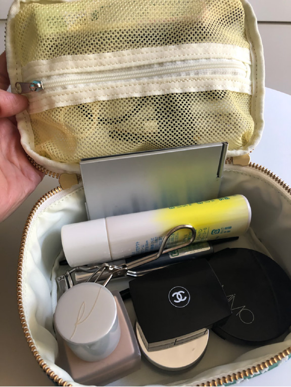 日々のメイク道具入れです。毎日使うものは、すぐ使えるように、細かいものも含めて手前の箱部分に入れています。毎日は使わない、毛抜きやハサミ、補充で買ってあるものは、ファスナー部分にまとめています。
