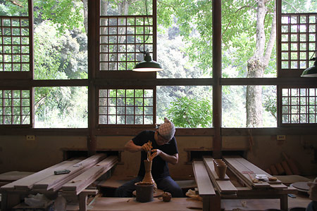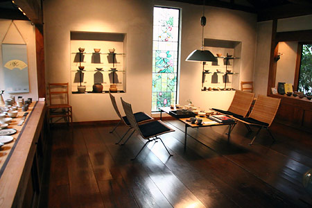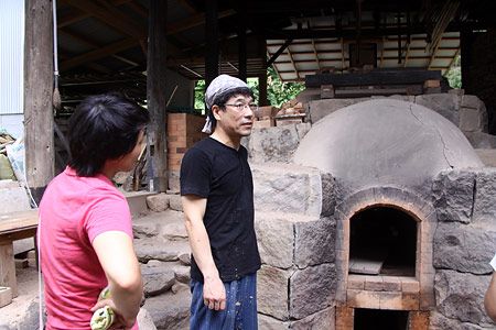 | 父(中里隆さん)に弟子入りしたのは 大学を出てすぐ、22か3のときです。 子どもの頃から、父からは、 中学卒業したらやきものをやれって 言われていたんです。 どうせお前、勉強が嫌いだから、 高校行かなくていいぞと。 でもやっぱり、高校ぐらい行きたい。 それで高校に行って、 体育会でヨットをやったら、 高校生のヨット人口というのは少ないですから、 全国大会に行けるまでになったんですね。 その推薦でこんどは大学に入ることになりました。 ![]() ▲隆太窯の工房にて。 高校のときは自分も やきものはしないって言ってたんですけど、 大学に行って、だんだん気持ちが変わりました。 理由は、食事です。 体育会の合宿とかって、ひどい飯なんですよ。 プラスチックの器にご飯がついであって、 それに野菜炒めみたいなのがどかっとのっかってる。 それをかきこむようにして食べる。 ‥‥2、3分で終わっちゃうんです。 それまで、毎日まいにち刺身という 家の飯がイヤだったはずなんですよ。 大人たちはだらだら酒飲んで、 毎日お客さんがいらして、 お弟子さんもいて、毎日が宴会だった。 それがたまらなく嫌だったはずなんだけど、 たまーにね、東京から夏休みに帰ってくると、 あれ? って思うんです。 刺身があって、酒があって、 器はプラスチックじゃない、やきもので。 ‥‥ああ、いいなあと思って。 ![]() ▲隆太窯の工房は天井がたいへん高く、 大きな窓から明るい光がさしこんでいました。 天井付近の壁には大きなスピーカーがあり、 クラシックがおだやかに響いてます。 大学卒業後、家にもどりました。 バブルの時代ですから、同級生はみな いいところに就職していくなか、 僕は実家にもどって修業を始めました。 そのころ、遊びに来た友人が驚くんですよ、 みんな就職していい給料貰ってるときに 小遣い銭程度しか貰えなくて、 ずっと薪割りしてる僕を見て 「よくやってるなあ」って言われました。 ![]() ▲ろくろ中。 手にしているコテは「牛べら」。 かたちが牛の舌に似ていることから、 そう呼ばれるようになったそうです。 修業を始めて1年ぐらいして、 すこし悩みが出ます。 お皿がやっとできるようになったくらいの時期です。 中里の家に生まれたからといって やきものをやっていていいんだろうかと。 それで、ちょこっと家を飛び出すんですね。 けれど、結局、どこへ行っても やきもの屋を覗いてしまう。 そうすると、みなさん、 父のことを知ってるわけです。 こうしていくら飛び出したところで、 結局どこ行っても中里の名前が付いてくる。 ならば、そんなことで悩んでもしょうがないと 思うようになりました。 ![]() ▲敷地内にいろいろな種類の窯があります。 小さい頃から窯焚きは好きでした。 といっても、じゃがいも持ってって、 砂に埋めてゴハンにしよう、というような “好き”だったんですけれど。 やきものと料理は、もちろん関係がありますよ。 たとえば魚を焼くも、やきものを焼くも、一緒です。 やきもの屋になるために必要な条件は 焼き魚をうまく焼けることと言ってもいい。 弟子が料理をするじゃないですか。 やきもの、揚げ物は熱いうちに出したいという 父の意向があるから、その場で焼いて出す、 その場で揚げて出す、 っていうようなことをするんですね。 あれも、感性があるんです。 余宮君はもうバツグンにうまかった。 こいつはやるなあというくらいにうまかったです。 ![]() 魚が焼けないやつは、 もう、いっつも怒られているんですね。 「いちいち、いちいちひっくり返すな」って。 魚は、じーっと待って、こんがり焼け目が付くまで 動かしちゃいけないんです。 ひっくり返すタイミングを知るには、 音とか、香りとか、 そういう五感を働かせないとだめなんですよ。 それはやっぱりやきもの屋にとって 大事なことだと思うんですね、僕は。 やっぱりね、処理の仕方とか、焼き方だとか、 いろんな工程で、 あ、間違った、どうしよう、 っていうんじゃだめなんです。 ばしって一発で決めないと。 ![]() ▲薪がおいてある建物の向こうに見えるのが ギャラリーです。 そしてその奥に工房があります。 ふだん作っているものは、 90パーセント、食器です。 今回、出品するものは、 その、ふだんつくっているもののなかから、 「ほぼ日」のみなさんが選んでくださったものです。 刷毛目は、白化粧を刷毛でしゅっと引き、 濃淡が出るもので、その模様が面白い。 粉引も同じ白化粧なんですけども、 液にずぶっと浸けるんですね。 釉薬や、焼き方、 炎の当たり方のちがいで色が微妙に異ったり、 釉薬をわざと薄くして すこしざらっとした感じを出したり。 あるいは絵唐津といって、 模様を筆で描いたものもあります。 そんなところも楽しんでいただければと思います。 ![]() ▲隆太窯の敷地内にある 中里太亀さんと隆さんのギャラリー。 使っている土、ですか。 このあたりの山から採ってきた土を 大量にストックして使