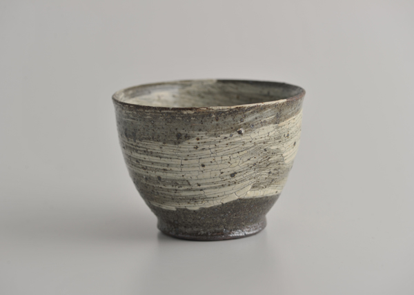 勢いのある刷毛の動きが、内側にも、外側にも。グレーの地色と、白っぽい刷毛のすじのコントラストに、土から出てきた鉄分の点々がアクセントになっています。男っぽい印象ですが、じつは、余宮さんのうつわは、女性にも人気があります。お茶にもお酒にも。いろいろな飲みものを、これで。
