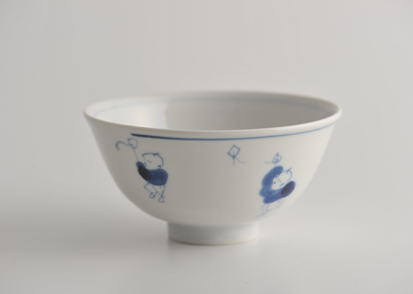 凧上げや風車で無邪気に遊ぶこどもたち。中国のこども、唐子(からこ)の模様は、子孫繁栄の縁起ものといわれるおめでたい柄です。山中さんは、これまで、お皿などにたくさんの唐子を描いていますが、ごはんの茶碗に登場したのはこれがはじめて。食卓をにぎやかに、楽しくしてくれそうですね。