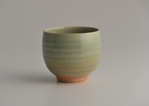 あたたかい飲みものの、湯気を包み込むような、まあるいかたち。灰釉の緑がかった色を、高台の土色のオレンジがやさしくささえます。暑いときには、氷を浮かべた飲み物を。からからと、涼しい音が聞こえます。