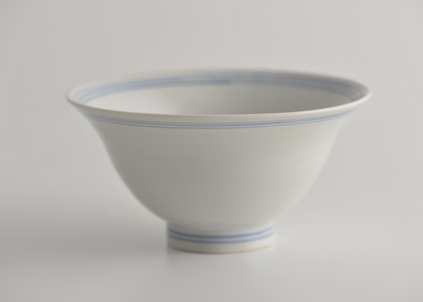 白磁飯碗(小)を、清潔感、シンプルな品のよさはそのままに、大きくしたものです。男のひとや、たくさん食べたいひとには、このくらいの大きさがうれしい。手描きの青いラインがつくる表情は、シャープにも、やさしげにも見えます。