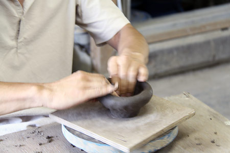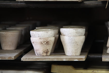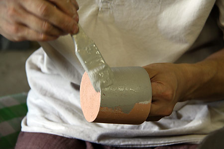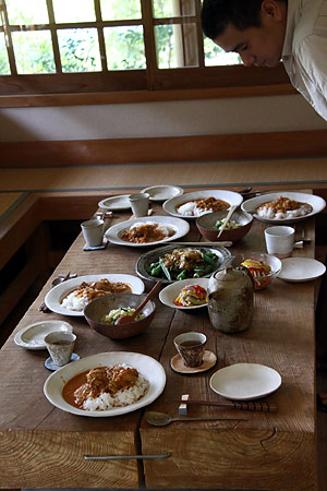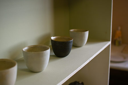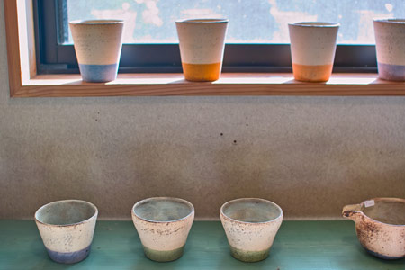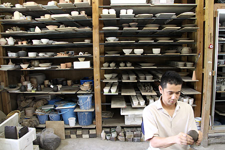 ![]() 大学は武蔵美の彫刻です。 デザイン科と違い、彫刻科って、 大学を卒業したあと、つぶしが効かなくて、 ただでさえ行くあてがないんですが、 しかも僕、すごいアトピーだったんで、 会社は勤められないなあと思っていました。 どうしようかなあと考えていたとき、 うちの父が勧めたのがやきものでした。 父は脱サラ組で、 36歳までデザイン会社に勤めていて、 そこから急にやきものの道に入った人なんです。 僕が小学生の頃です。 その父からのアドバイスで、 技術さえあれば、 やきもので食っていくことはできるぞと。 もし自分の作品をつくりたいのなら、 バイト代わりに賃引き(湯のみ1個幾らで請け負う)で 生計を立てればいいじゃないかと。 ![]() ▲石原稔久さんのご自宅のギャラリーで。 なるほどと思ったものの、 自分には基礎がなかった。 子どもの頃は父の仕事場に入るのは禁止でした。 大学終わって、初めて父の仕事場に入ったとき、 あ、こうなってるんだみたいなぐらい、知らなかった。 大学時代にテラコッタっていう、 ちょっと素焼きみたいな粘土を扱ったんですが、 「石原はやきもの屋だからよく知ってるよなあ」 って言われるんですけど、全く知らなかったです。 少ししか触ったことがなかった。 それで、茨城県の笠間っていうところに 父の知り合いの作家さんがいらっしゃって、 そこで修業をはじめました。 1年間、草むしりとか土練りなどをして、 紹介状を書いてもらい、 茨城県立窯業指導所に入りました。 そこでは1年間、 湯のみから急須までっていう カリキュラムが組まれているんです。 先生が、ひいたのを見て、合格すると飯碗にいく。 で、合格するとマグカップ‥‥というふうに、 早い人はどんどん終わっていくんですね。 で、僕は半年で最後の急須までいっちゃったんです。 すごく楽しかったせいもあって。 残りの半年は、学校に時々行くかたわら、 笠間の産地の作家さんの窯炊きとか、 窯作りとかを体験でもうどんどん回り始めました。 そこで窯の築(つ)き方も教わりました。 どこの窯炊きもローテーションが組まれてて、 3交代か4交代で回ってくんですけど、 そのローテーションに入るのがすごく大事なことで、 そうすると全部吸収できる。 で、入るために必死で薪とか割って、 お金とかも全然貰わずに、とにかく勉強です。 そうして学校での1年間が終わりました。 ![]() 学校を卒業する頃に、 ちょうど父が窯を引っ越すということで、 いっしょにやらないかということで、 福岡に帰り、父の仕事場を借りるかたちで 自分の仕事をはじめました。 戻ってきたとき、24歳です。 結婚をし、近くのアパートから 親父の仕事場に通いました。 いっしょにといっても、 |