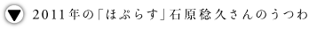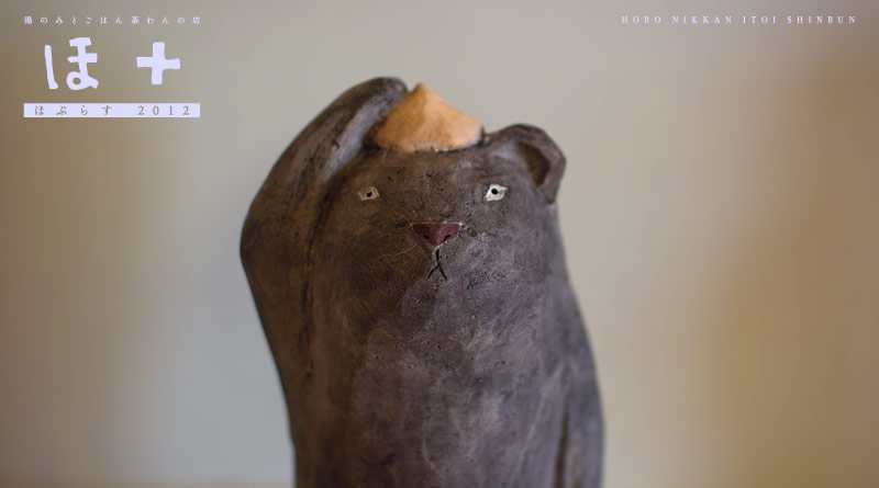 ![]() 前回の「ほ+」のあと、 敷地内で工房をつくりかえて、 2011年1月にちいさな引っ越しをしました。 引っ越しって、リフレッシュしますよね、気持ちが。 そして3月に1冊目の絵本が完成しました。 絵本をつくるきっかけになったのは、 北九州の到津(いとうづ)の森公園の 動物園でひらいた 「どうぶつのかみさま」という個展でした。 うつわではなく、人形の個展で、 やきものでつくったどうぶつの人形が、 絵本の1シーンごとに展開するような、 物語性のあるものでした。 ![]() その開催日が3月19日で、 その前に会場をすごく作りこむんですね。 壁から、何から作りこんで。 で、もういよいよ搬入です、という時に 震災が起きました。 直接的な被害はすくない土地でしたけれども、 九州新幹線のオープンも ぜんぜんお祝いしなくなっちゃったし、 動物園も第三セクターなので、 市の行事ってもう軒並みキャンセルだったんですよ。 で、もちろんぼくの個展も やっぱりキャンセルの話が出たんですが、 動物園の園長さんがとても熱心な人で、 「いま、こういうことをやらなくて、いつやるんだ」 って言ってくださって。 「こういうのを、見せなきゃだめなんだ」って。 ![]() その個展では、はじめて物語の展示をしたという以上に、 いままでとはちがう、 うつわでは出会えない人たちに出会えたことが とても大きかったです。 おじいちゃんが孫に、 読み聞かせしながらいてくれるとか、 そんなお客さんがいたりして。 その体験を通じて、 絵本づくりをライフワークみたいにしたいなぁ、 と思っていたら、 その絵本を被災地に送りたいってかたが けっこう、いらっしゃって。 そんなつもりでつくったんじゃないんですけど、 思わぬことになって、とても、うれしかったです。 それが昨年春のできごとです。 ものをつくることに、 近道と遠まわりって、ないのかもしれないけれど、 人といろんなことを話しあってつくっていくのって、 ぼくには、たぶん、近道だと思うんですよ。 もちろん、遠まわりしたっておもしろいに違いない。 その自分だけの世界で、わたしはこれですって言って 誰の意見も取り入れずに、 こんこんとやる道もぼくはすごい好きです。 でも、いろんな人とやって、 おもしろいものどんどん作っていくっていう、 ぼくは、そういうタイプなんだと思います。 ![]() そんなふうに、ちょっと違う分野に ふれる機会があったのが、 おもしろかったなと思っています。 というのは、逆にそっち側をやると 今度はもううつわを作りたくてしかたがなくなるんですよ。 人形をたくさん作ってるともう、 ああ、うつわが作りたいー! ってなって、 うつわをずーっと作っていると、 人形作りたいな、ってなるので、 ちょうど、バランスが取れてる。 そしてうつわにも変化がありました。 「わたしが」っていうことに こだわらなくなれた、っていうか。 前は、うつわに自分の個性をどうやってこめるか、 まず人に手に取ってもらうこととか どうやって自分のうつわであるってことを 認識してもらうかみたいなことを、 すごく考えていたんだと思います。 とにかく作家がたくさんいるので、 まず、手に取ってもらえないと、 次の仕事がこないんですよね。 だからまず、 「石原さんってこういう仕事なんだな」 っていうのをわかってもらえるように、 特徴的な仕事をやってたんですけど、 ここ1、2年、 自分が何かやったらそこには、 ぼくなりの何かがあるんじゃないか、 というふうに思うようになりました。 あんまりインパクトみたいなことに こだわらなくなったかもしれないですね。 ![]() 2011年になってから、磁器も始めました。 今回は間に合いませんでしたが、 もし来年も、「ほ+」から 声がかかれば出したいなと思っています。 あるいは少しベージュっぽい、白土のものとか。 ぼく、ほとんど黒土しか使わなくて。 基本的には鉄分が入ってる土がほとんどなんですけど、 最近わりと鉄分のない土でたのしみ始めています。 最近、ろくろも使うようになりました。 以前はろくろ恐怖症っていうか。 「ろくろ使ったら、ぼくじゃなくなる。 手びねりじゃなきゃ」みたいな気持ちが あったんですけれども、いまは、別にかまわない。 多少、まだろくろに関する距離感は残ってるけど、 手びねりがそこそこやれるようになってるんで、 ろくろもいいかなぁと思っています。 ![]() いま、30代の後半で、 作家に、“乗る時期”っていうものがあるとしたら、 たぶん自分がだんだんそういう時期に向かって、 もう気持ちの準備ができてきてて、 からだも、技術的にも、 いろんなことが整い始めてる時だと思うんです。 いままでの先輩たちが作ってくれた世界で ぼくたち、やってるじゃないですか。 安藤(雅信)さんだったり、福森(雅武)さんだったり、 いろんな人がこのやきものの世界を作ってくれて、 ぼくらはわりとその、かきわけられた道、 開拓者というよりもかきわけられた道を歩いてる。 