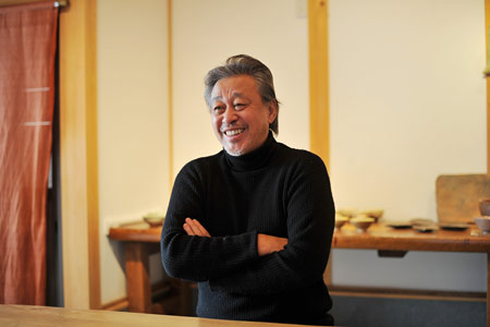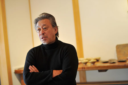 ![]() この1年、すごく精力的だった? そう見えますか。 何、「ほぷらす」で今回、 ぼくのがいちばん早かったの? わっはっは。そうですか。 作りたいものから作った、それだけですよ。 いやあ、何もないですよ。 偶然、重なったんですね、いろいろ。 たしかに東北にも何遍も行ったし、 あちこちで個展も多かったかもしれんけど、 こういうことはね、決めても、 どうなるかわからないとこがありますでしょう。 ま、料理と一緒やね。 ![]() 震災の影響ですか──。 行ってね、実際を見たら、 やっぱり気持ちが変わりました。 海の、想像もできないエネルギーというのは、 人間の気持ちまでも圧倒してしまうというかね。 やっぱりもう、何ていうか、身が止まるというか、 時間が止まるというかねえ、 気持ちも全部止まってしまうというような 感覚になったんですよ。 鳥肌が立ってね。 ‥‥考えることを超えたものを、 自分の身に感じられるということがありましたね。 だからどうだということでもないんだけど、 行くと、本当に喜んでくれる人たちも いっぱいいるわけね。 何をしたらいいのか悪いのかもわからなかったからね、 実際、喜んでくれたというのがよかった。 ![]() そう、昨年、器では、磁器をやりましたね。 たしかに何十年ぶりやね。 これは、土との出会いだったんです。 前から、向付の型だけは作ってたんですわ。 それで、ちょうどそれに合うような磁器土が見つかった。 明時代によく似たものができてるんですよ。 古染付というんですけど、 それの雰囲気で何かを作りたいと思ってたから。 そういうチャレンジだったんですね。 ![]() 道歩や円は──、私はまだ、 そういうふうに(同じ作り手として) 見るということはなくてね。 まだあの子らの物が、完成してませんので。 迷ってますか? わっはっは、そうですか。 ずーっと自分で自分を迷いながら、 しばらく行くんじゃないかなと思います。 迷ってていいんですよ。 だんだん年代経って、何かの壁があったりすると、 越えなければならないんです。 それはつらくて、どうしようもないものだけれど、 越えなければ、次ができませんからね。 物というのは何か一つあったら、 それを乗り越えてまた自由になって、 またこう迫ってきて、また自由になるという、 それをどんどん繰り返していかなかったら、 そこで止まってしまうんですよ。 例えば文章を書いててもね、 前から同じ調子のものでずーっと書いてると、 何かもう一つ違う意味の雰囲気を出したいと思ったら、 そこから抜け出さなきゃならないでしょう。 それを繰り返さなきゃならない。 自分が感動しなかったらお客も感動しませんからね。 同じですよ。何でも同じ。 ![]() 何というかね‥‥自分の考えというのは、 積み重ねていく人が多いんだけど、 あるとこからそれも脱却して、 いつも真っ白に戻るほうがいい。 いつも真っ白に。 そこから出発して、また真っ白になる。 積み重ねたらね、必ず途中で不安定になるんです。 例えば字を書くのでも、 上手な人の字を下に置いて書くと、 ある程度上手にはなるんだけど、 もうどうにもなりません。 自分の自由な形ちゅうのができなくなっちゃう。 概念から入るというのはそういうことです。 |