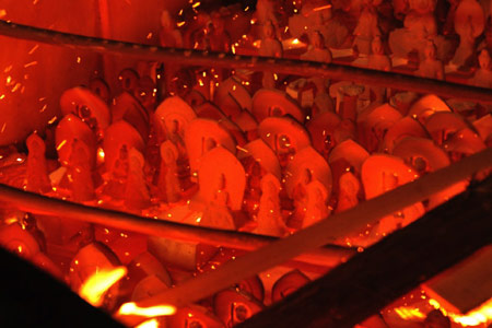 この蹴ろくろのいいところは、余韻です。 力を使ってないわけでしょ。 惰性で回ってるわけです。 ゆっくりで、早くつくる。 ![]() ▲電動ろくろではなく、 自分の足で蹴ってまわす「蹴ろくろ」を使います。 高台をね、比較的こうして高くすると、 持ったときに熱くないでしょう。 お茶漬けっていうのは、 ちょっとごはんがあって、お茶をたっぷり。 だから大きめがいい。 まわりがそんなに熱くならないほうがいい。 熱いと、お茶わんを口につけられない。 そういう条件がね、 ごはん茶わんをつくるときに体に入ってるんです。 ![]() ▲片手で、のびのびと、すぅーっと引きます。 守ったら、ダメなんですよ。 こういう形がいいと一度いいとなると、 まあみんなが評判とるでしょ。 でも、それを守ったら、 もう自分の二番煎じになるから。 それは勢いがなくなる。 ![]() ▲これは昨年の野焼きのようすです。 ![]() ▲燃えさかる炎のなかには、何百ものうつわと‥‥。 ![]() ▲赤いような、時には、白光のような色を放つ陶仏が。 よろしければ「福森さんの野焼き」もごらんください。 円も道歩も同じことを言ってましたか。 それが基本だからね、私のところの。 みんなね、外の形をつくろうと思う。 こう見て、この形がいいという。 違うんよ。 形をつくろうと思っちゃいけません。 ろくろを回していて、 中が、こうゆったりぐわーっとひけたら、 外もきれいになってるのよ、自然に。 ![]() 私のうつわを色っぽいと糸井さんがおっしゃった? ああ、色っぽいんだろうね、本人が。あはははははっ。 何も考えてないよ。 何も考えてない。 もう少し開いたものとか、 ちょっと締まったものを、というのは思うけど、 他は何にも考えてません。 お茶漬けしたら、というのも、 つくる前に、自分の体に入ったものだから。 「お茶漬け、これはお茶漬けにいいように」って、 考えてつくってたらもうダメです。 形じゃないの、場面。 場面っていうのは、たとえばごはんを食べる場面、 お酒を飲む場面、お茶を飲む場面っていうのが、 そのお客様が来た場合もあるし、 毎日飲む場合もあるし、 そういう場面っちゅうのがあるわけでしょう。 だけど、それにぴったりと生理的にこう、 何ていうか、合ううつわっていうのは、 それはすべてそれが満足せんと合わないわけ。 作り手個人が出てたら、うるさくてもう合わない。 ![]() ▲福森さんがよく言われること。 「器は前に出ず、後ろに下がらず。 使えば料理とともに引き立てあう。」 だけど、こっちがね、 夢がこう‥‥夢っていうか、 個をなくすというの。 自分が“大きく”なかったら、 皆さんに行き渡らないのよ。 大きいほど行き渡るから。 自分=個性、と思ってたら、 皆さんが、絶対、毎日使うのに、飽きちゃうから。 個をなくすとね、 人のことも関係ないし、自分も捨てられるし。 個も、他も、自他も、因果も、 相対も、なんにもないところを。 ![]() ▲今回、出品するごはん茶わん。 この時点では、福森さんはまだどういう化粧をするか、 どういう釉薬をかけるか決めてません。 これにこの後、何やるか? ははははっ。 わかんないですよ、そりゃあもう。 釉薬は灰を主体にした薬をかけようとは思ってて。 あとは、刷毛目をやってもええかなとか、 まあいろいろ。 もう日々変わると思っといてもいいくらいやからね。 ![]() ▲後日、できあがった灰釉刷毛目飯碗がこちら。 いい陶器っちゅうのはつかまえどころがないのよ。 「こっちつかまえた」と思ったら、 どっかまた逃げられたような気がするし。 自分でつくっても 「いいのができた」なんて思わんですよ。 沈黙するのよ、うつわが。 うつわが沈黙して 使い手のもとで、勝手に育っていくのよ。 はっはっはっ。それはいいうつわ。 自分がこうだと思ってるよりも、 ずーっとよくなっていくんよ。 そういうふうに、私は思ってるんだけどね。 こっちの予想のようにできたらおもしろくないね。 私から離れたとたんに、 違う道を進むんよ。はははっ。 それがおもしろいんよ。 この年になったら、ずい分それが 「はあっ、おもしろいもんだな」と。 ![]() 「いい」というのはね、 まあ何でもそうだけど、悪いのでもいいのでも、 全部、一時間とか一分ずつでも動いてるわけ。 だから、みんなね、西洋的に考えると、 ここで切って、これがいいか悪いかを みんなで議論するわけよ。 東洋的に考えたら、 全部これは移り変わってるのよ、もう絶えず。 あいつの思想が嫌いだと、こう思うでしょ。 ほたら、たとえばそれが 恋愛関係になったらみんなよくなる。 そうでしょ? はははっ。だから、みな、動いてんのよ。 諸行無常という、そういうもんなんだ。 |