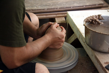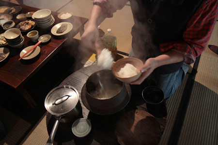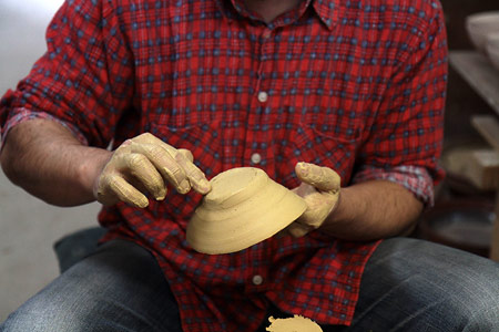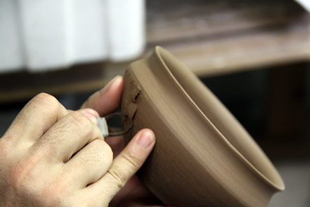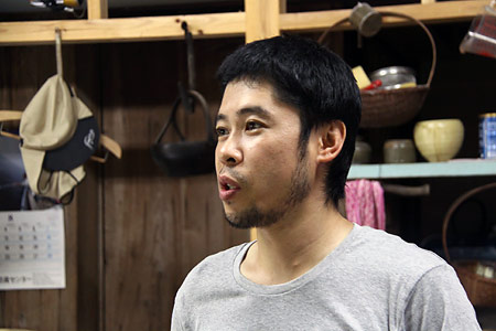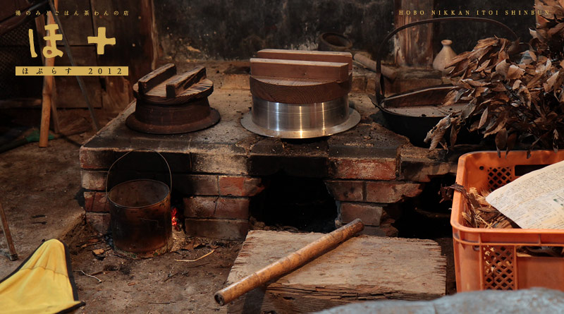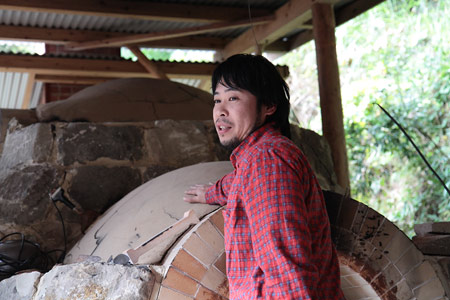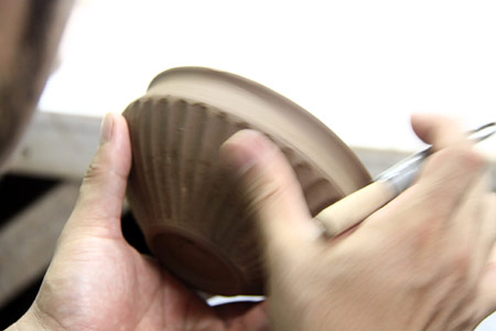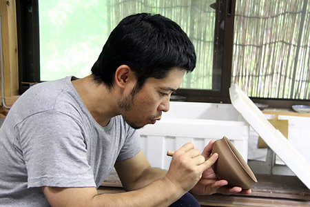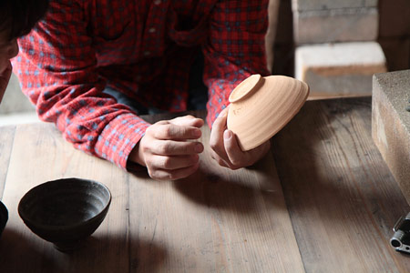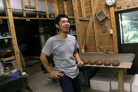 ![]() ろくろの引き方を変えたんですよ。 意識的に変えました。 これがいまつくってるお碗です。 これが前つくってたお碗。 ちがい、わかりますか。 いまのは、見込みを低くしているんです。 碗の底がテーブルに近いと、 料理盛ったときに器と料理が すごくきれいだなということがわかって。 前のは、高さがあるでしょう? こっちにしたら、使う人の評判もいいんですよ。 そのためにどうすればいいのかを考えて、 土取りの仕方から、変えたんです。 ![]() いや、とくにきっかけがあったわけじゃないんです。 ずーっと取り組んでたんですよ。 おいしく見える器ってなんだろう、って。 そしてあるとき、自分のつくった器で、 よく使っていて、何をのっけてもいい器、 っていうのがあることに気づいたんですね。 ついつい、そればっかり手に取るっていうか。 それが家にあった。 これなに乗っても様になるなぁ、 なんでかなぁ、って思っとったら、 裏の削りが浅くて、器の底が窯の棚板にひっついて、 売り物にならなくて家で使ってたものだったんです。 それに料理を盛ると、置いたときに、 なんだかテーブルから生えてるみたいに見えて、 かっこいいんですよ。 テーブルに近ければ近いほど 盛ったときにきれいだということがわかった。 ![]() けれども──、思いついたものの、 すぐにはそんなふうにできないんです。 それでろくろの引き方を変えて、 最近やっとできるようになりました。 だからいま、ろくろがすごくたのしい、 つくるのもたのしい。 また、あたらしい窯もできて、焚くのもたのしい。 そんな時期なんです。 ![]() 窯ができたのは3月です。 ちょうど震災のさなかで、 どうしようと思いました。 東京で展示会をやっていたんですが、 途中で予定が打ち切りになった。 ![]() やっと、高台の低いうつわができたのが最近です。 ろくろは──、たぶん、ギターの弾き方を変えたとか、 バッターがスイングを変えるみたいなことだと思います。 ほんのちょっとだけど、大きく変えました。 ![]() その引き方は、こうにちがいないということは、 頭の中にあったんですね。 けれども技術的にできなかった。 でも、するしかないと思って、練習したんです(笑)。 無意識にできてる人もいることなんだけれど。 ![]() そんなふうに、あたらしい引き方、あたらしい窯で、 「ほ+」のごはん茶わんをつくったんですが、 最初、一窯、全部失敗してしまって。 200ぐらい引いたんですが、 窯の温度が上がりすぎてしまって。 でも、失敗してよかった。 いい練習になりました。 今回は、磁器も出します。 磁器(天草)のめし碗と湯のみ、 陶器の鎬の湯のみとめし碗をって考えてます。 磁器をあらためて始めたきっかけは、 信頼している井上典子さんというかたに 磁器をやりなさい、磁器が焼けなきゃダメよって 言われたんです。 僕、もともと、磁器の職人だったのでって言ったら、 そういう意味じゃなくて、あなたの磁器よって(笑)。 でも、まだぜんぜん探せてないです、自分の磁器。 探り探りかもしれません。